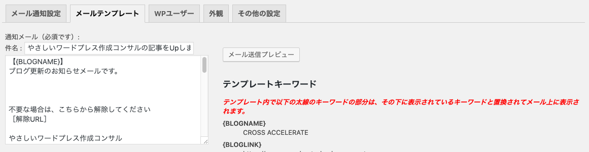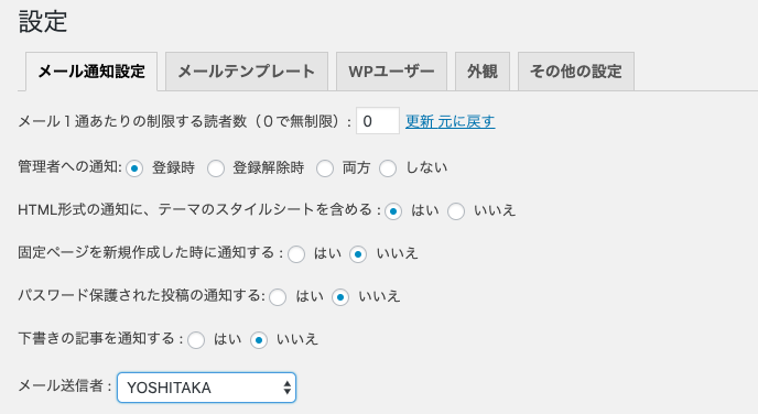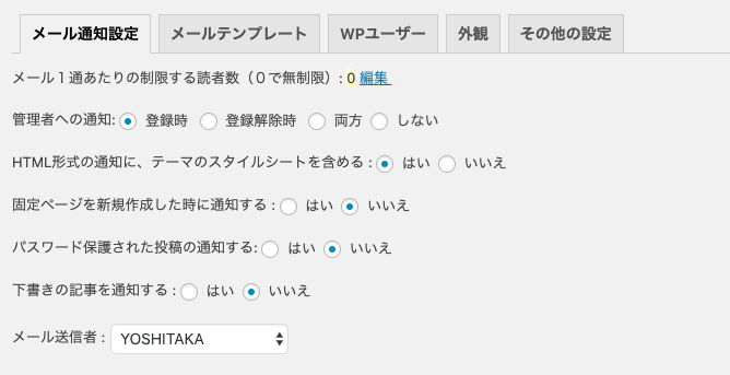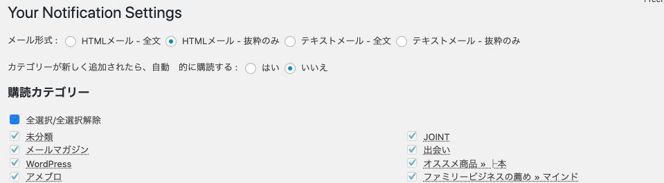 通知するメール形式やどのカテゴリーの投稿記事を通知するか設定します