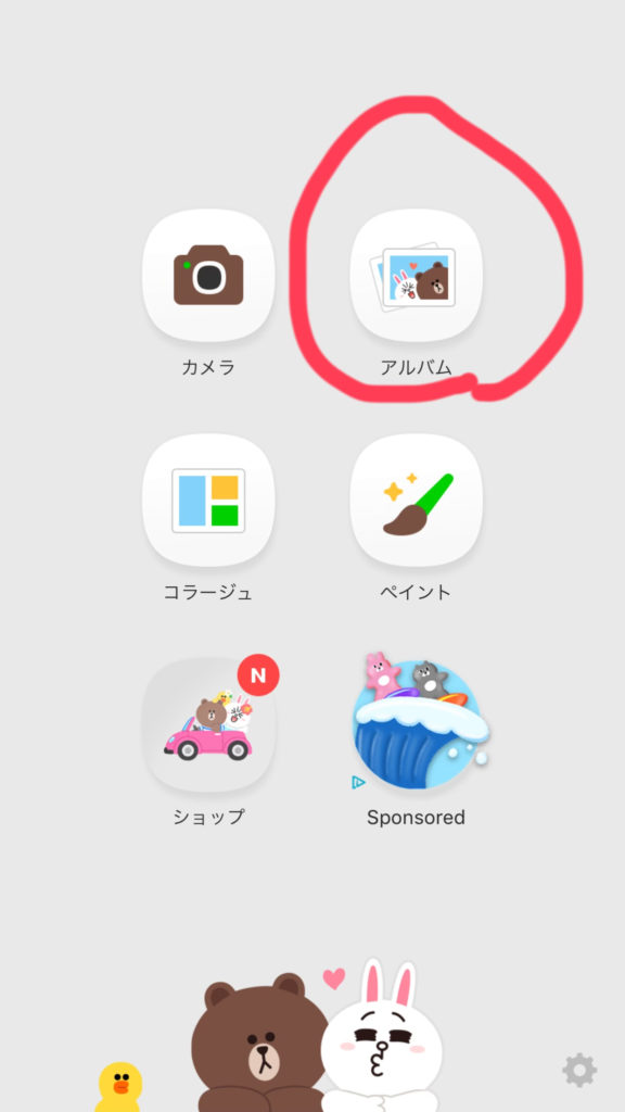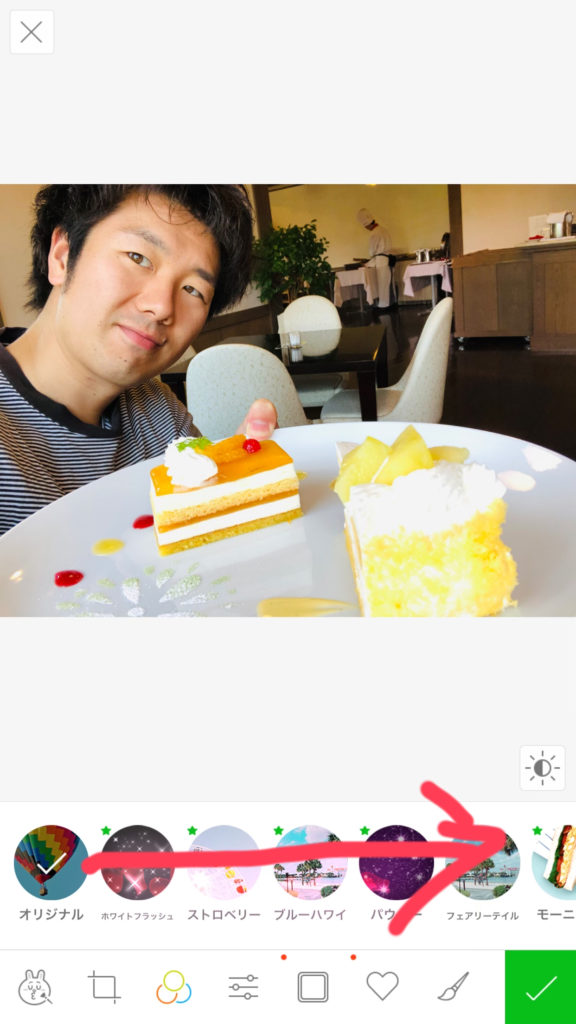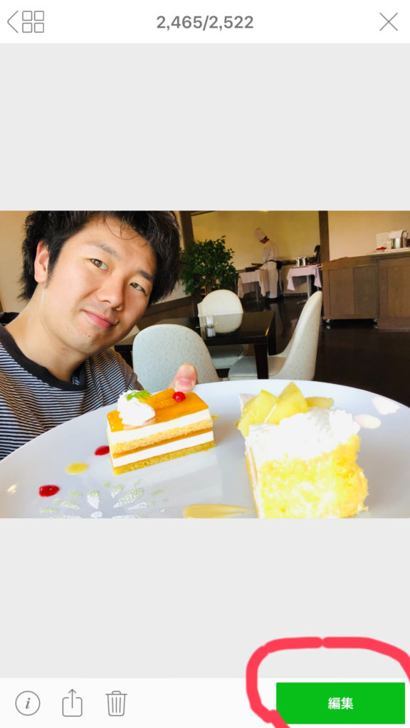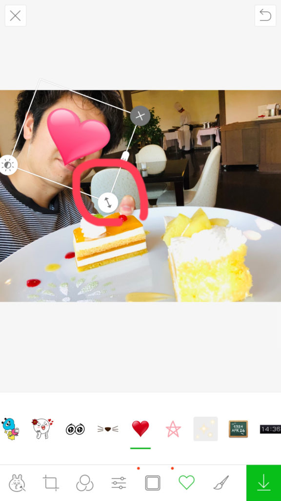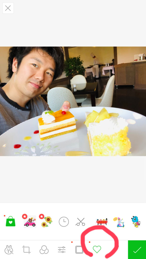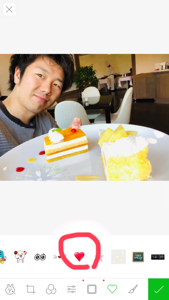 ②スタンプを押したい写真を開き、画面下のメニューからスタンプ(ハートマーク)をタップ