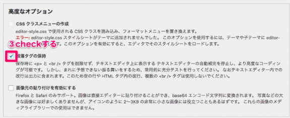 「高度なオプション」の「段落タグの保持」に✅️チェックを入れ