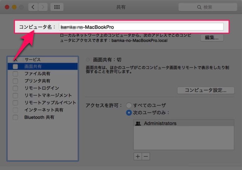 「システム環境設定」を開き、その中の「共有」を選択した先にあります。