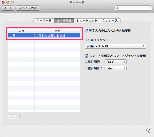 これをすることによって iPhone と同期すると Mac でも iPhone でも、文字を少なく打ちながらも長い文章が打てます。