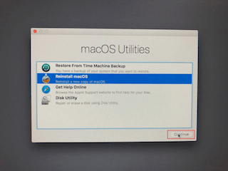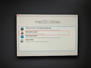- 「macOS Utilities」が起動しますので、その中の「Reinstall macOS」を選択します。