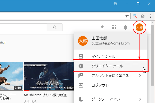 YouTubeの画面右上に表示されているプロフィールアイコンをクリックし、表示されたメニューの中から「クリエイター ツール」をクリックして下さい。