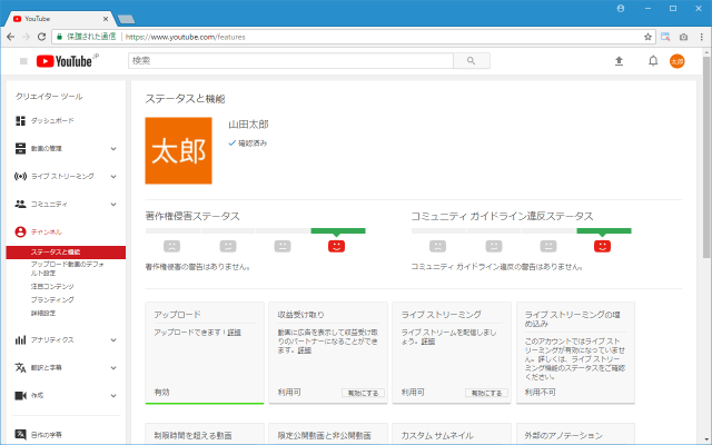 次のように「利用可」と表示されていた場合は、まだ15分を超える動画のアップロードが行えません。