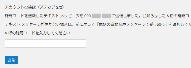 - 送信されてきた6ケタの数字を次のテキストボックスに入力し、その後で「送信」クリック