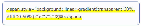 <span style=”background: linear-gradient(transparent 60%, #ffff00 60%);”>ここに文章</span>