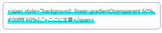 <span style=”background: linear-gradient(transparent 60%, #00ffff 60%);”>ここに文章</span>
