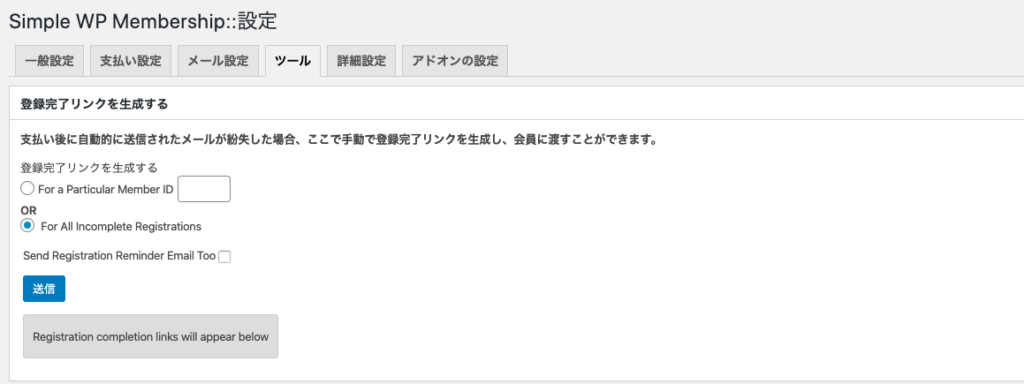 「WP Membership⇒設定⇒ツール」