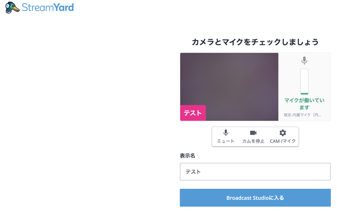 StreamYard(ストリームヤード)のBroadcastスタジオに入っている状態です。