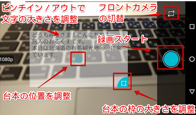 撮影に用いる台本をタップすると、カメラが起動し、動画撮影モードとなります。