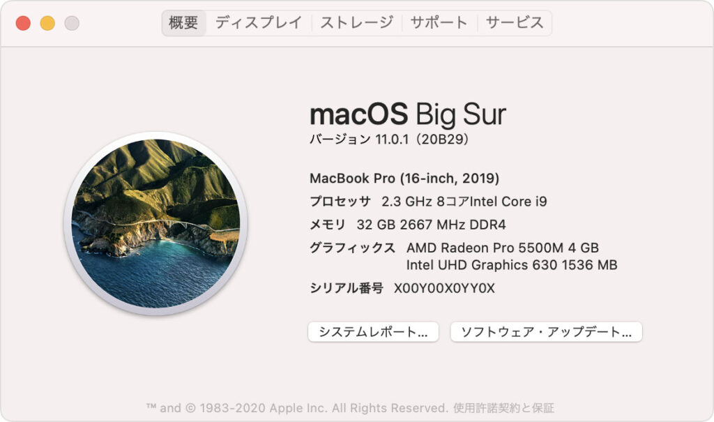 Mac の概要情報として、モデル名やシリアル番号などが表示されます。
